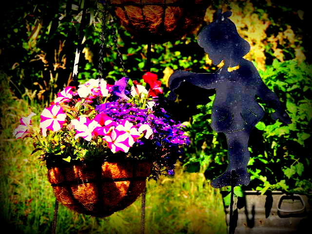 Basket6 Published July 15, 2014 at 640 × 480 in From The Gardens ← Previous Next → My yard art silhouette girl watering a hanging basket!