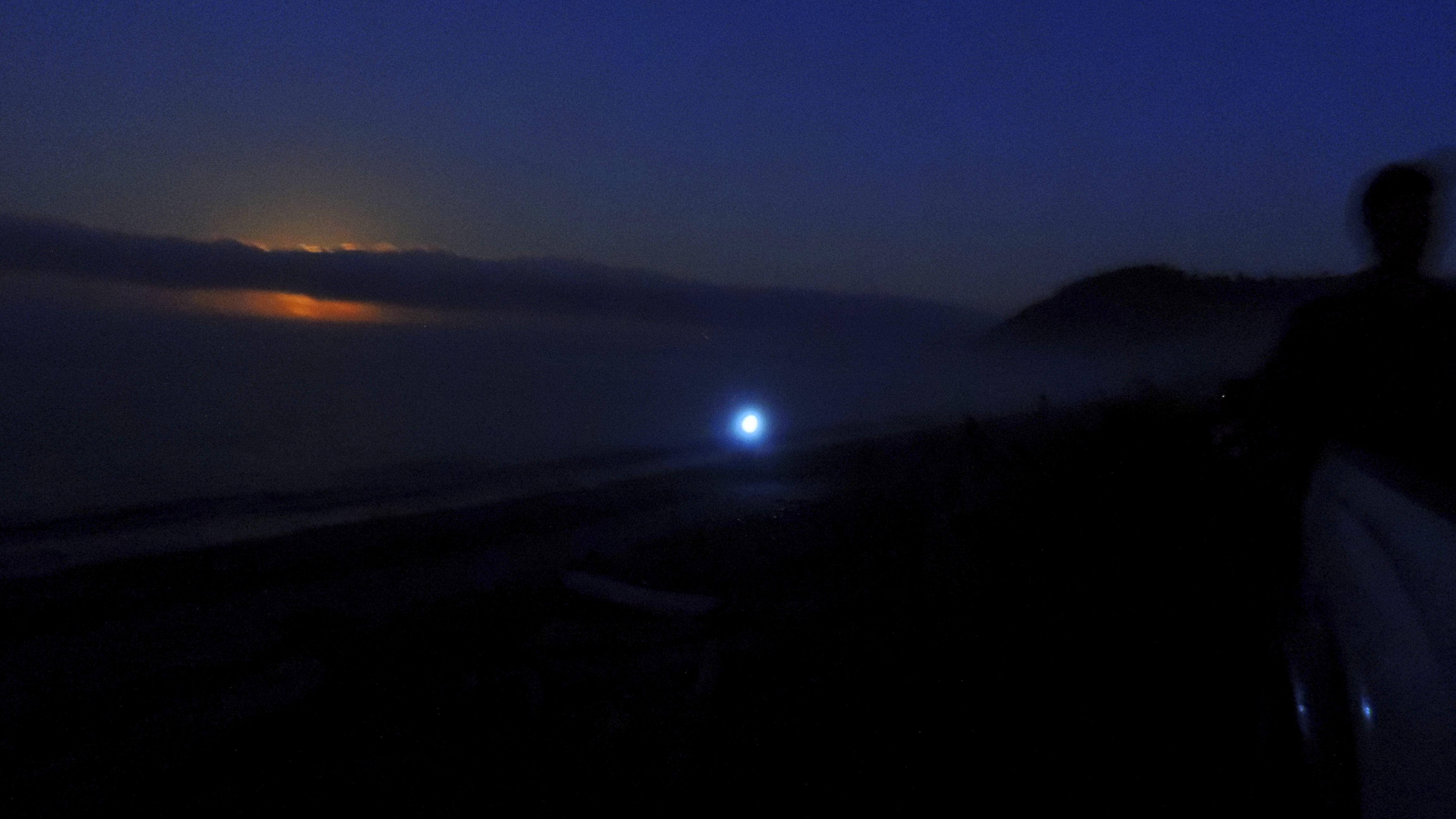 The moon hides behind a band of clouds, giving it a dramatic look. That bright light is a fisherman with a head lamp on.