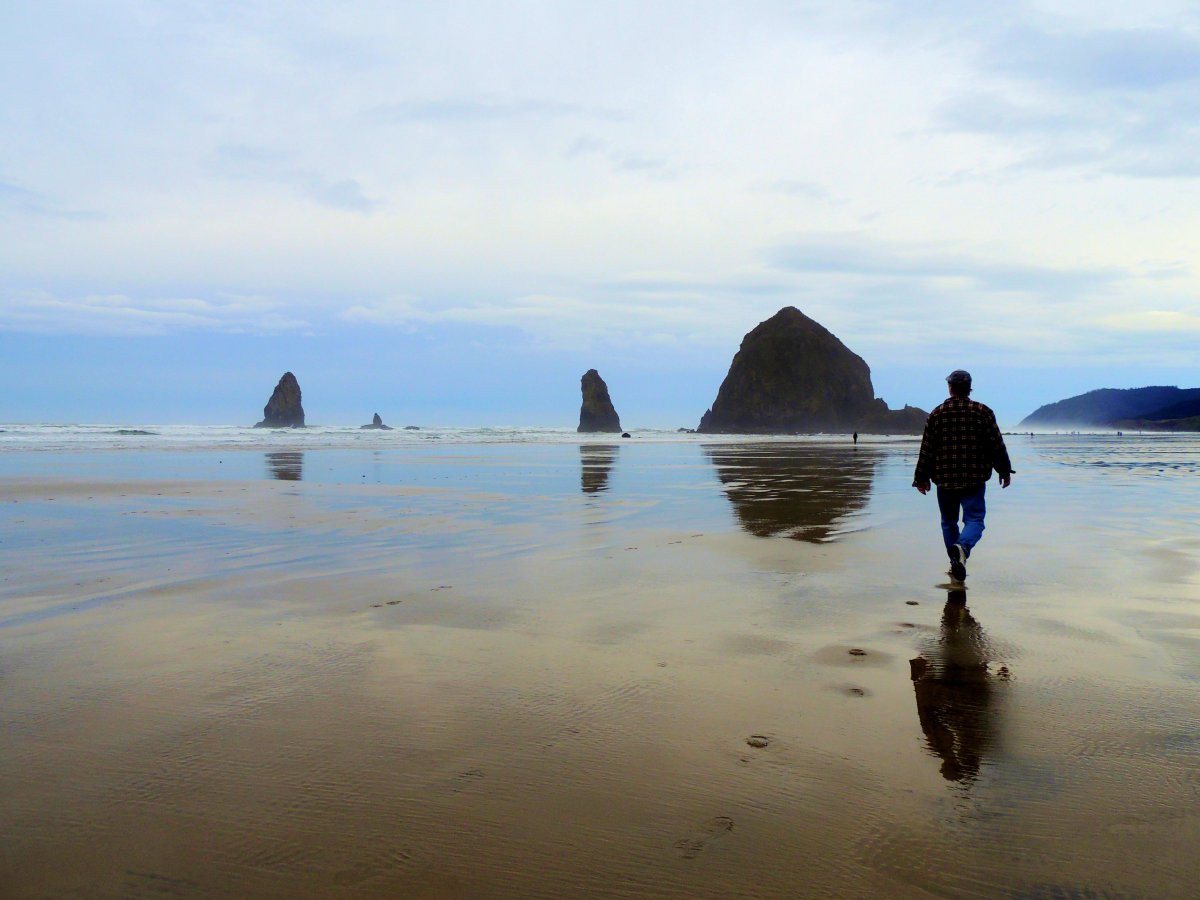 Haystack Rock Published April 7, 2016 at 4608 × 3456 in Stormy Seaside ← Previous Next → Hubby trekking towards Haystack Rock; about a mile away….
